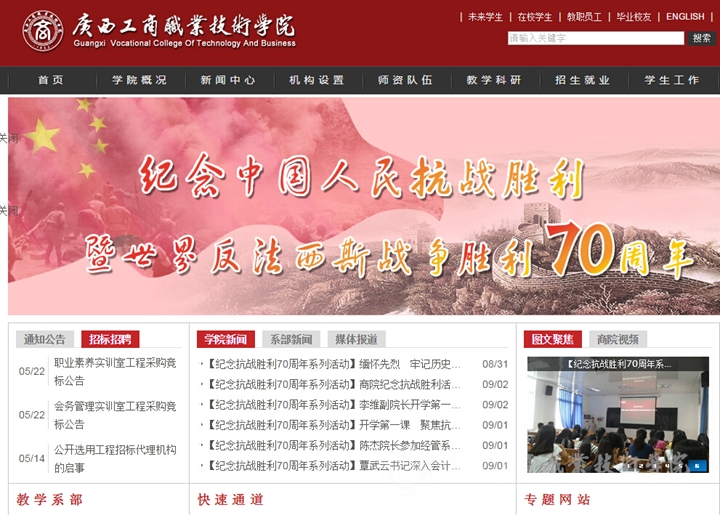 利用网络平台扩大纪念活动受众。在学院网站主页开设了纪念中国人民抗日战争胜利70周年“网上祭英烈”的网页。并组织全校师生员工登录学院网站主页,向抗战英烈鲜花留言,在网上高扬爱国主义主旋律,凝聚牢记历史、圆梦中华的网上正能量。在学院主页最显著的头图位置更新主题为纪念中国人民抗日战争暨世界反法西斯战争胜利70周年图片,在网络平台上营造浓厚的纪念氛围。同时,利用微信、微博等新媒体推送纪念抗战胜利70周年相关内容,多渠道扩大纪念活动受众。