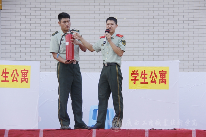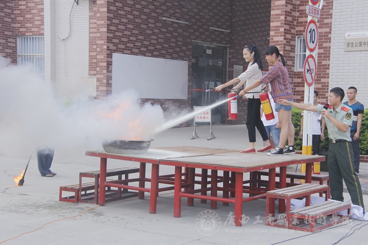 最后,武警南宁市西乡塘消防大队领导讲授消防安全知识,他通过火灾现场的影像资料,图文并茂地为广大师生讲解了火灾的危害性、楼层发生火灾后的逃生与自救方法、如何使用灭火设施。消防安全知识讲解结束后,消防官兵做了灭火操作的演示,并邀请部分师生现场操作灭火器。在他的指导下,师生体验者提着灭火器,按照灭火步骤和方法,将白色的粉末喷向大火,很快将明火扑灭。