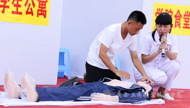 演练活动第三项是急救方法演练。由广西中医药大学第一附属医院仁爱医护人员讲解正确的急救知识、急救方法和模拟人体进行急救,并邀请学生代表进行急救方法的体验。