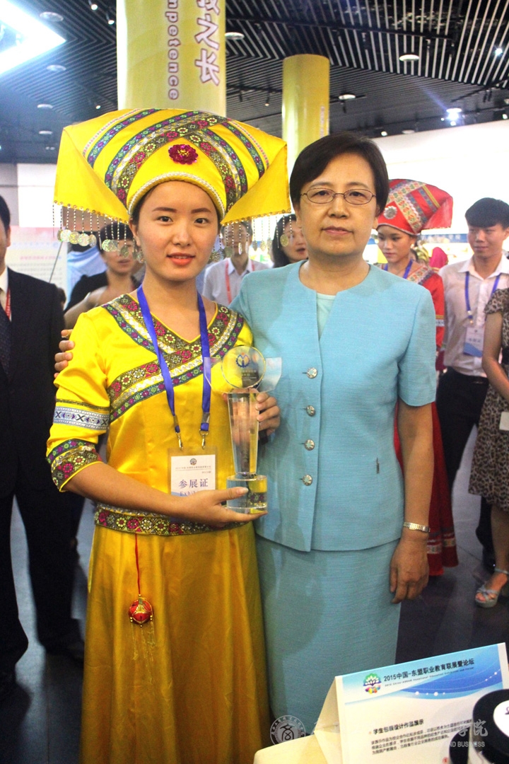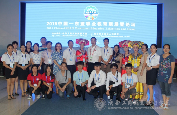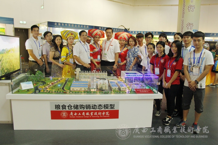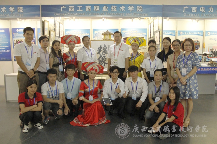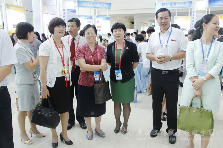 教育部副部长鲁昕、广西副主席李康等领导观看了我院的食品检测展示台。在我院广告设计展示处,鲁昕副部长与2015年获全国高职市场营销职业技能竞赛团体奖一等奖的成员之一陈铺娟亲切交流,陈铺娟同学向鲁昕副部长简单介绍了我院的职业教育展示特色,鲁昕副部长表扬陈铺娟是个优秀的学生,并一同合影留念。