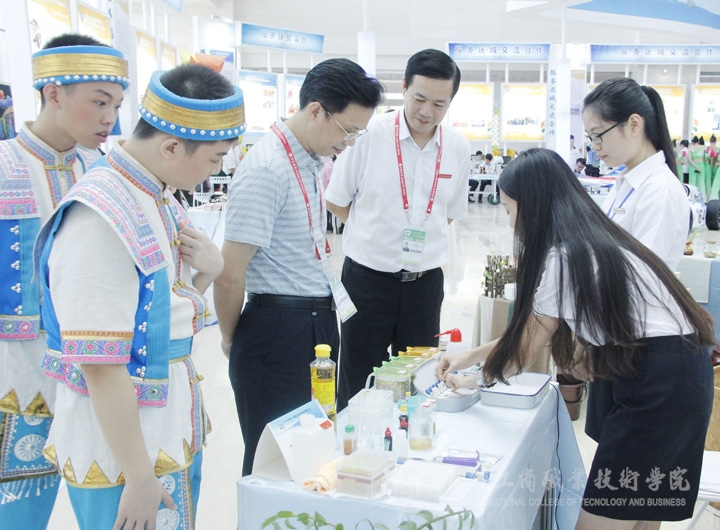 中午12点时,粮食局人事处韦尚英处长到我院展厅参观指导。韦处长参观了我院展示的粮油食品快速检测技术项目,食品检测专业的学生向韦处长演示了检测大米新鲜度、黄曲霉毒素B1、农药残留的过程;随后,还参观了粮食生产模型以及粮食产品包装设计展示项目,与学生进行了交流,并对我院特色展厅表示赞赏,并与我院参展队伍合影留念。