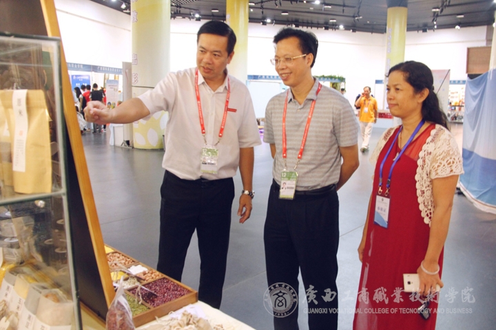 自治区粮食局领导重视东盟职教联展工作,韦尚英处长(左三)亲临展位指导