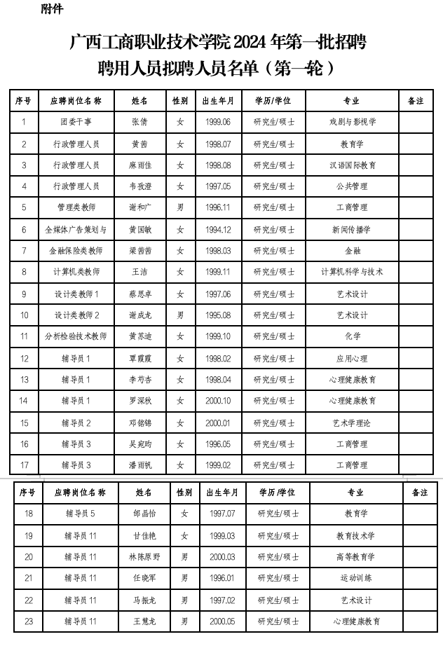 根据《广西壮族自治区事业单位公开招聘人员实施办法》(桂人社发〔2011〕155号)和《pp电子官方网站2024年第一批招聘聘用人员公告》相关规定,经报名、资格审查、综合考核、思想政治素质考核、体检等程序,经研究,拟聘用张倩等23名同志到pp电子工作,现将拟聘人员名单(第一轮)予以公示,公示期为7日(2024年7月15日至2024年7月21日)。公示期内如对拟聘人员有异议,请以书面形式,并署真实姓名、联系方式及联系地址,于2024年7月21日18时前寄送到pp电子官方网站人事处(直接送达以送达日期为准,邮寄以寄出邮戳为准)。地址:广西南宁市鹏飞路15号pp电子官方网站人事处(2212办公室);联系人:李老师、詹老师;邮编:530008;电话:0771-3160065。如实反映拟聘用人员的有关问题受法律保护。