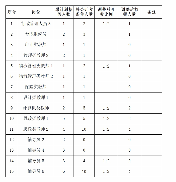 (八)辅导员6岗位开考比例调整为1:2,招聘人数由6人减少至5人。