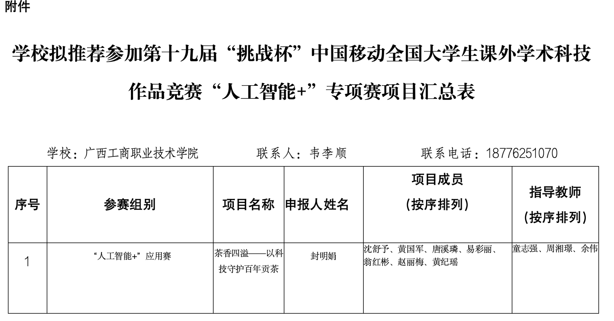 根据《关于参加第十九届“挑战杯”中国移动全国大学生课外学术科技作品竞赛“人工智能+”专项赛的工作指引》,经学生自主报名提交作品,学校遴选,拟推荐《茶香四溢——以科技守护百年贡茶》至共青团广西区委、全国组委会参加评审,现进行公示,详见附件。