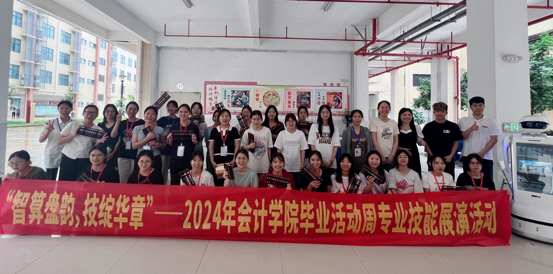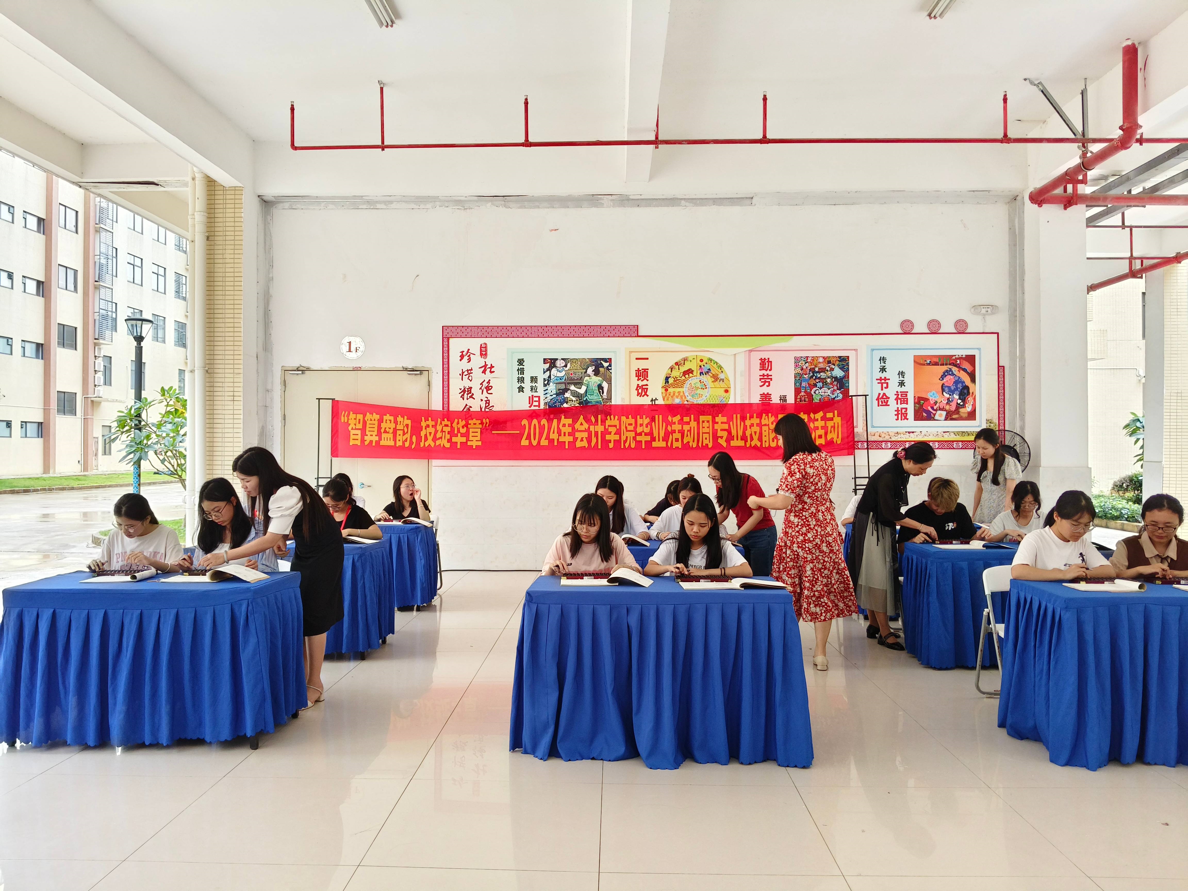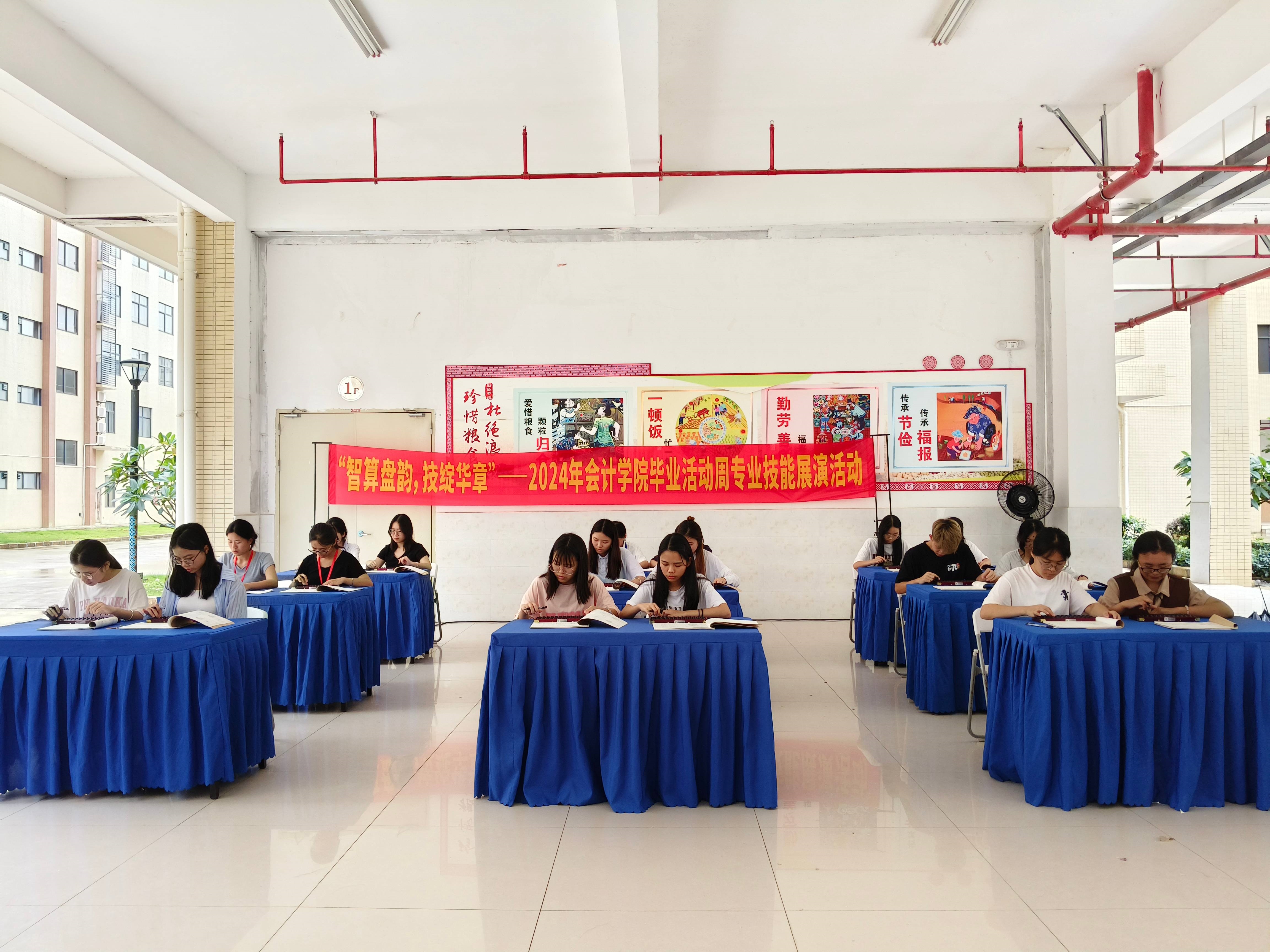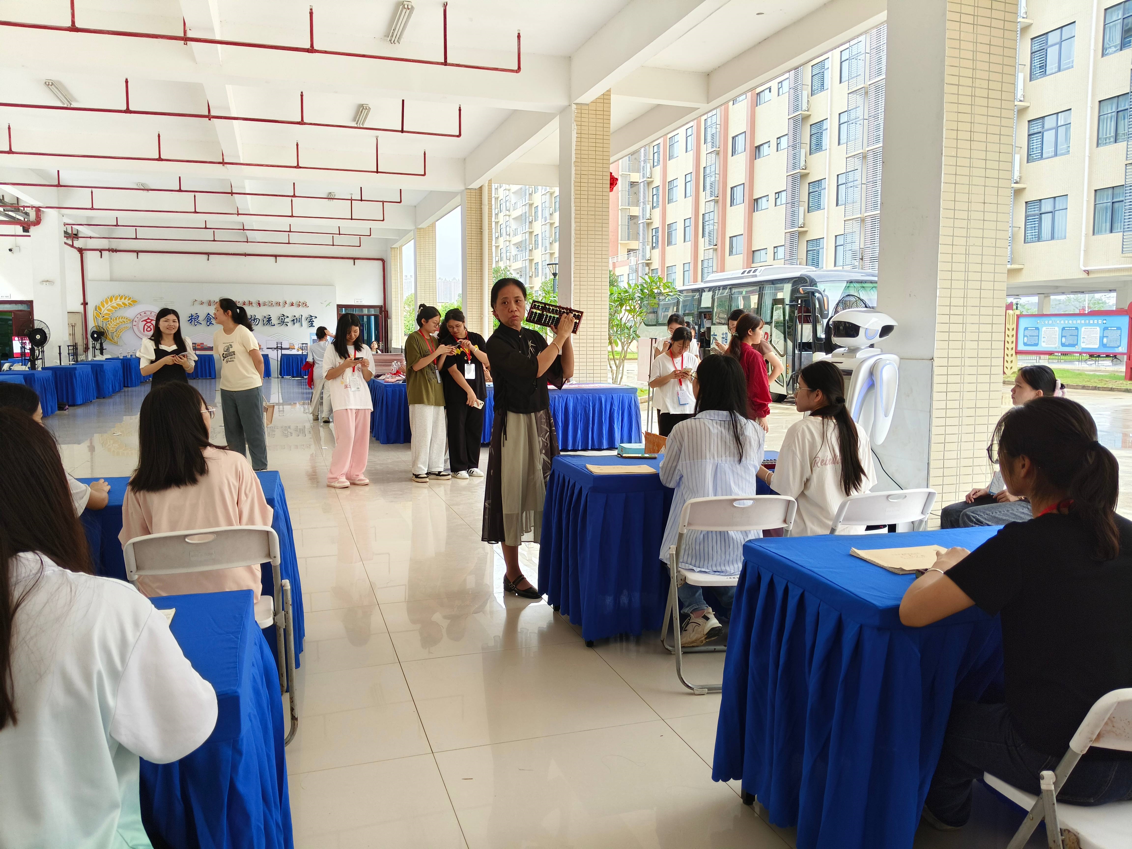 为了在2024年毕业活动周上全面展示智慧会计专业群的特色和专业建设成果,会计学院2024年6月26日下午在武鸣校区A5架空层举办“乘珠算之韵味,展技能之风华”技能比赛,以珠算竞赛和财务机器人对话的方式展示传统会计文化与数字经济时代会计的发展。