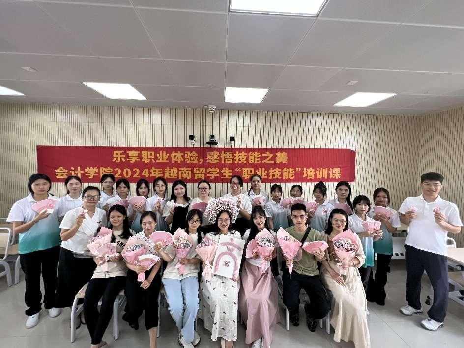 我院学生佩服外国朋友在非母语和陌生环境的情况下,积极参与讨论、大胆展示的勇气和担当。外国学生也纷纷表示,第一次参加这种形式的研学活动,非常新鲜有趣,既收获了技能知识,同时也感受到中国老师和同学无处不在的热情和细致入微的关怀,与大家结下了深厚的友情。研学结束,我院学生向外国朋友赠送了用“人民币练功劵”折成的纸花,寓意着美好祝福与深厚的友谊。带队的越南教师表示,此次研学活动不仅能增进学生们的见识,也是对越中传统友谊的传承。