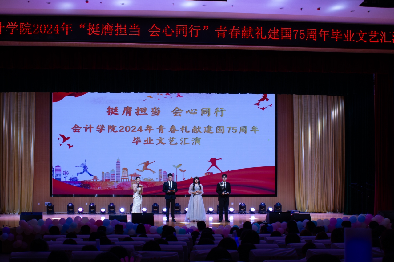 岁月不居,时节如流。几载校园生活即将画上句号,一批莘莘学子即将离开校园踏上新的征途,同时,为增强同学们学习党性思想知识,注重实践,建立新功的红色教育理念,引导会计学子坚定不移听党话、跟党走,奋力书写为中国式现代化挺膺担当的青春篇章。会计学院于2024年6月18日下午在武鸣校区东区大学生学术中心举行2024年“挺膺担当,会心同行”青春献礼建国75周年毕业文艺汇演。参加本次活动的有会计学院党总支书记、院长粟卫红,副院长李娜,学生科科长周思池,团委副书记刘倩以及会计学院全体教师与2022级、2023级的同学们。
