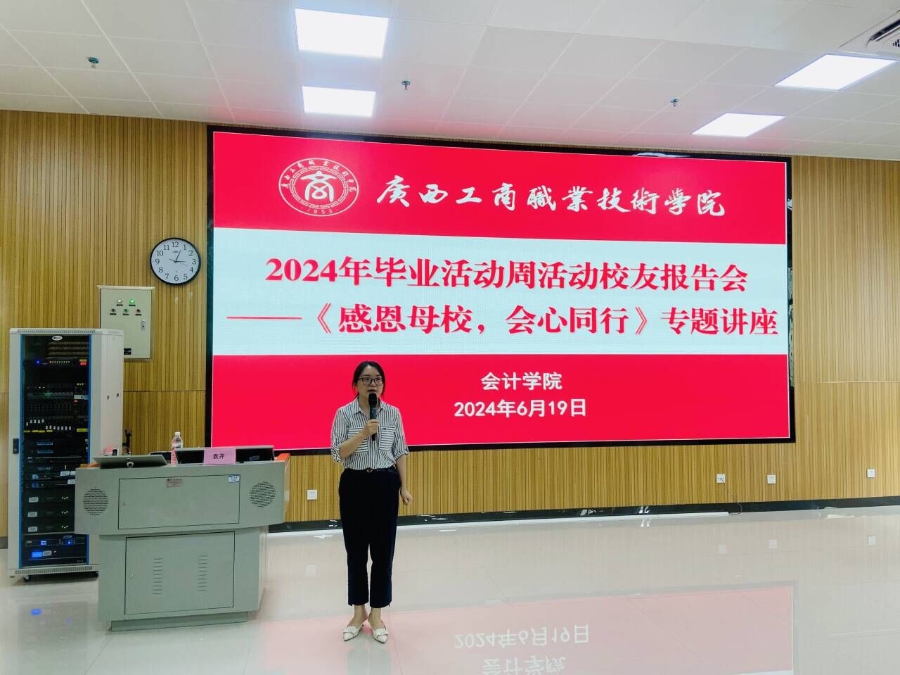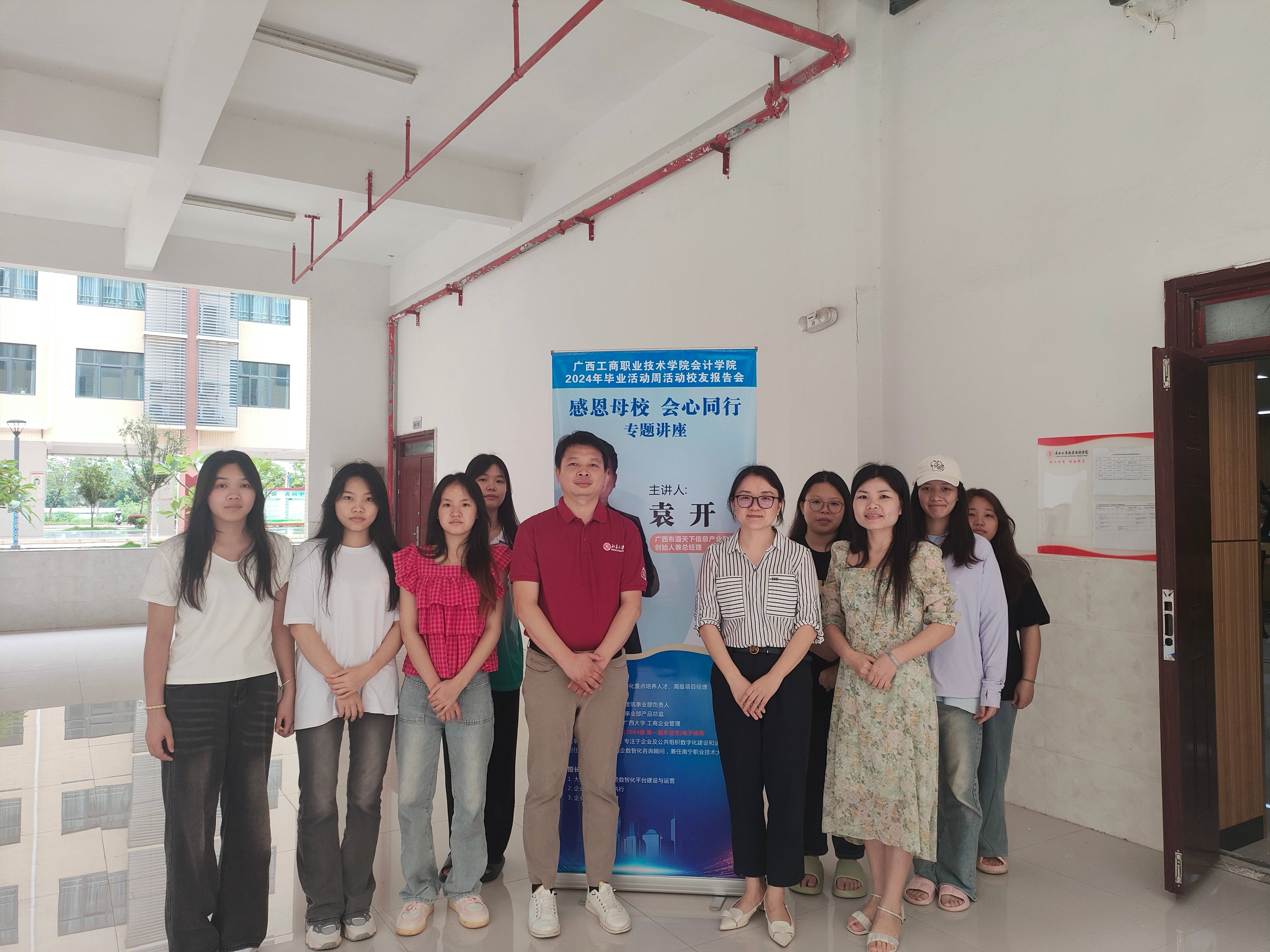 6月19日下午,会计学院2024年毕业活动周活动校友报告会——《感恩母校,会心同行》专题讲座在A5-102阶梯教室举行。优秀校友袁开同志(原2004级电子商务专业毕业生),现任广西布道天下信息产业有限公司创始人兼总经理受邀作为主讲嘉宾从职场致胜、感恩母校及创业经历等方面为师生们带来了一场的精彩讲座。会计学院教师以及2022级全体学生参加会议,会议由会计学院副院长谭玉娥主持。