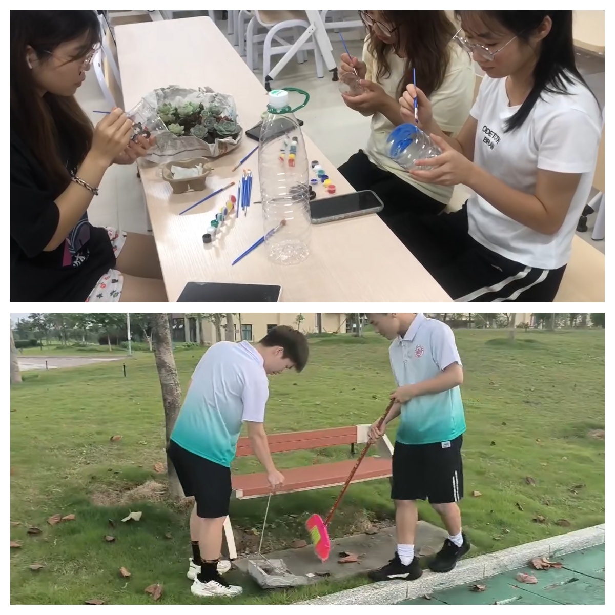 活动二是同学们利用平时所收集废弃的塑料瓶、打包盒和快递盒等可回收废品,发挥能工巧手,制作不同的“阳光绿植”盆栽,争奇斗艳的绿植也让同学们心里充满暖阳。除了盆栽,学生干部利用快递包装箱制作了垃圾分类箱,激发同学们更多的创作热情。