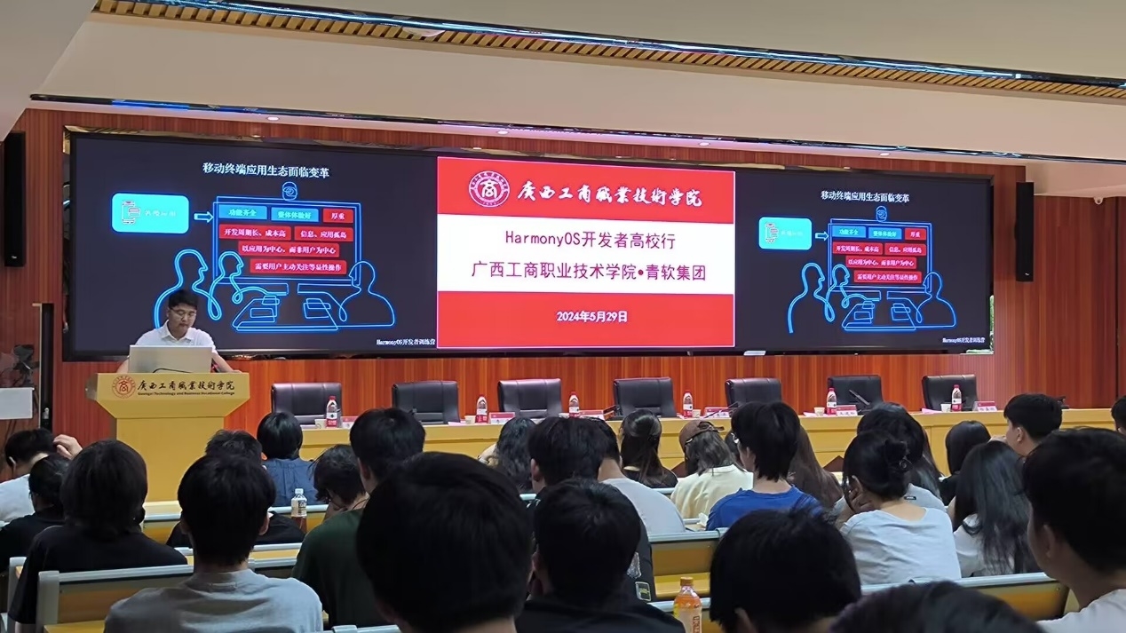 随后,青软创新科技集团股份有限公司高级工程师李伟以《迎接鸿蒙产业新时代,开启HarmonyOS新技能》为题作报告,为参会师生介绍了鸿蒙产业发展背景和HarmonyOS中涉及的新技术,并对HarmonyOS和OpenHarmony的区别进行了详细的介绍,使同学们对未来行业发展前景有了全新的认知,最后鼓励大家积极参与到HarmonyOS应用开发中来,共建鸿蒙产业人才生态发展。活动最后,青软创新科技集团股份有限公司运营专员杨嘉欣向在场师生们介绍了鸿蒙开发者认证操作流程,鼓励同学们积极参与,为未来职业发展奠定基础。