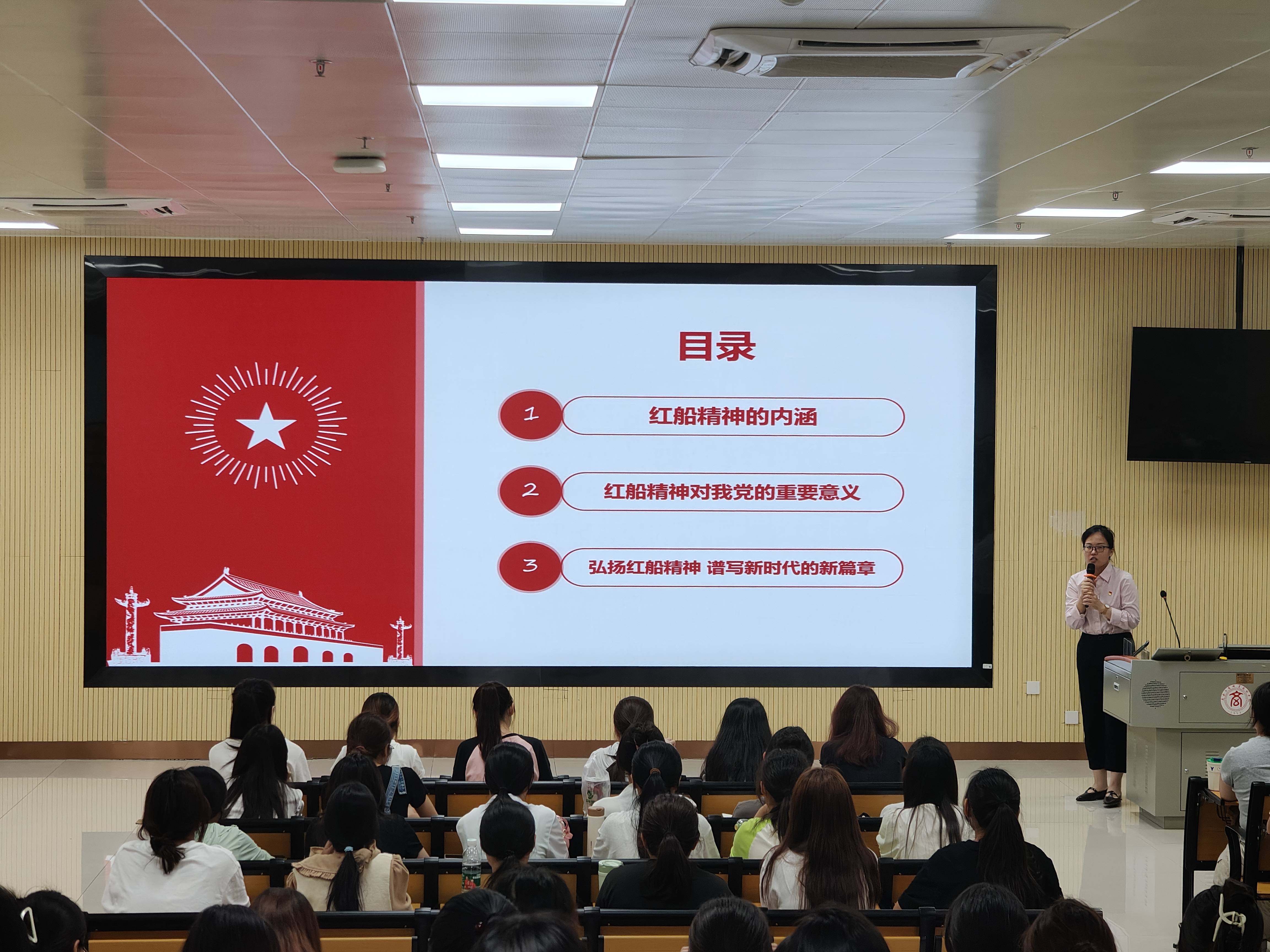 课程开始,周思池老师从红船精神的内涵、红船精神对我党的重要意义、弘扬红船精神,谱写新时代的新篇章三个方面给大家讲述了什么是红船精神。红船精神具有“开天辟地、敢为人先的首创精神”,“坚定理想、百折不挠的奋斗精神”,“立党为公、忠诚为民的奉献精神”。1921年,中国共产党第一次全国代表大会在浙江嘉兴南湖的一条游船(后称“红船”)上胜利闭幕,庄严宣告中国共产党的诞生。从此,中国的新民主主义革命就有了坚强的领导者——中国共产党。中国共产党一直秉承红船的创新精神,不断开拓进取,带领中国人民走向民族复兴。周思池老师强调,红船精神是重要精神航标,具有巨大的精神能量,在新时代的美好时期,弘扬和践行革命红船精神将更好地激励当代青年大学生勇敢地担当起时代赋予的历史使命和社会责任,促使我们勇于创新、艰苦奋斗、无私奉献,成长为实现中华民族伟大复兴的坚实力量。