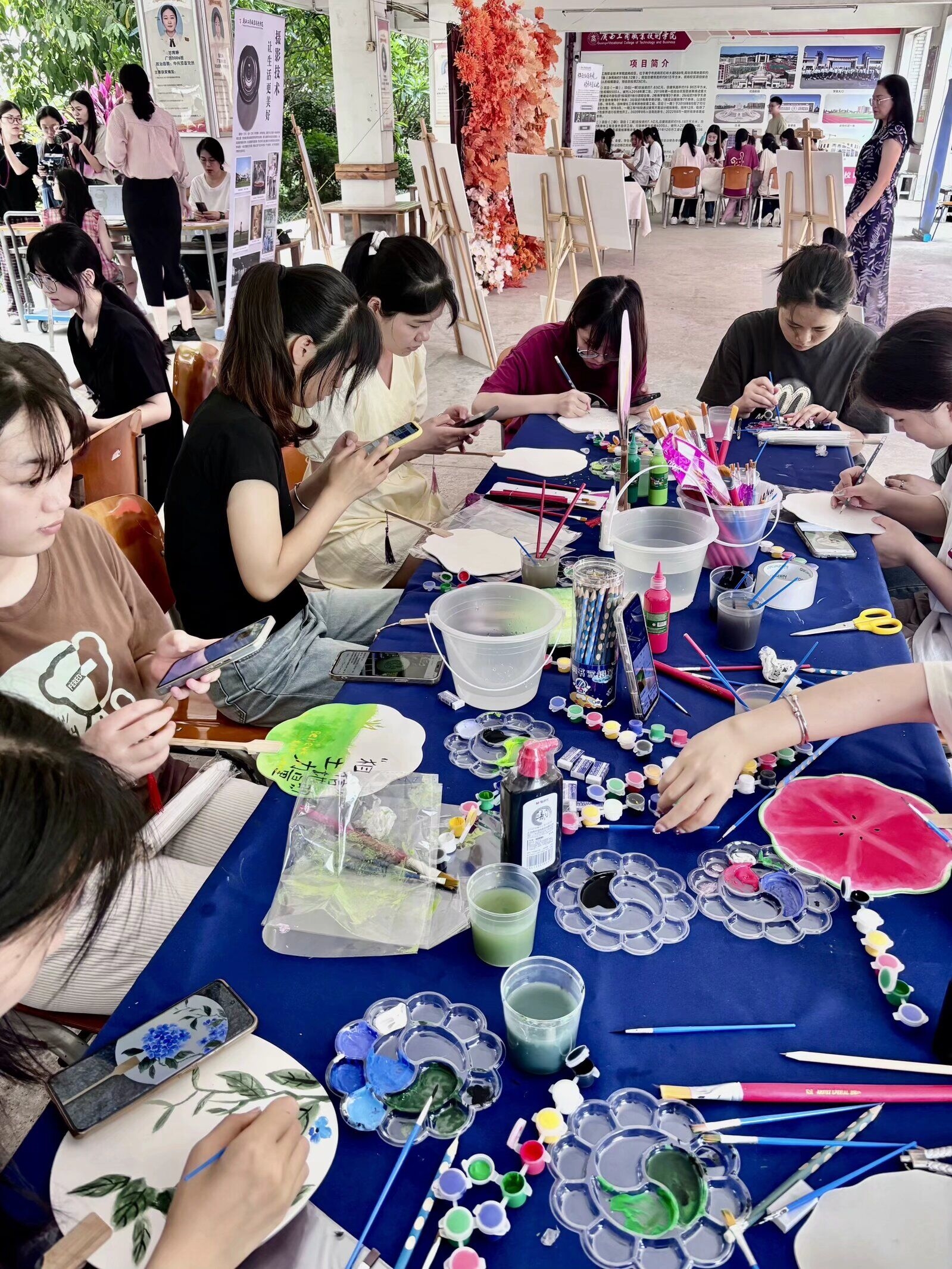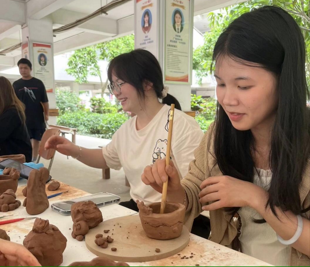 当天下午,鹏飞校区教学楼架空层“摄影技术,让生活更美好”的活动现场,学生手持相机,或捕捉校园内的美丽瞬间,或聚焦于师生们忙碌而充满生机的身影。不仅展现了他们的摄影技术,更传递出他们对生活的热爱与感悟。“体验红陶制作,传承非遗文化”的摊位也吸引了不少人的目光。在这里,师生们亲自动手,从和泥、拉坯到刻花,红陶作品在师生们的手中逐渐成形,充满了创意与个性。同学和老师们不仅体验到了传统手工艺的魅力,更深刻感受到了非遗文化的博大精深。“技能强国,现场绘画创造美”的活动将现场气氛推向了顶点。同学和老师们现场手绘团扇、纸伞、画布,观众们纷纷驻足欣赏。