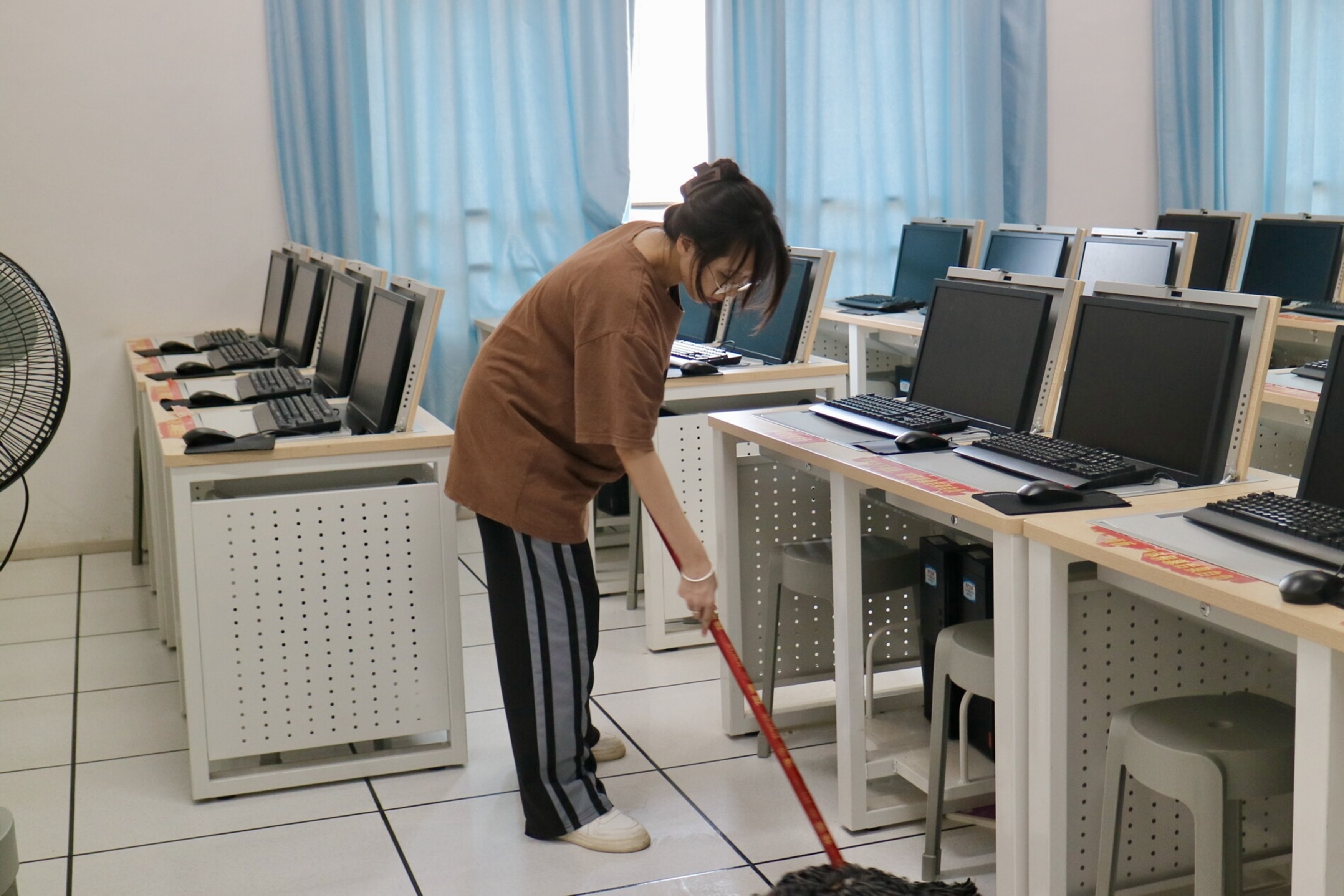 活动当天,志愿者们在A3架空层下集合完毕,经会计学院团委、学生会学习部工作人员安排,分别前往各自负责的机房。到达目的地后,志愿者们手持劳动工具,化身清洁小卫士,迅速投入到机房清扫工作中。活动现场,志愿者分工明确,分别清理着机房内的垃圾、擦拭桌椅与键盘缝间的积灰、扫净地上的灰尘等。整个过程中,志愿者的身影在机房内穿梭,尽管工作辛苦,但志愿者们的脸上始终洋溢着满足和自豪的笑容,展现了不怕脏、不怕累的精神风貌,大家齐心协力,共同为机房的整洁环境贡献自己的力量。最后,志愿者将劳动工具归还原处,此次机房清扫志愿服务活动圆满结束。本次志愿活动虽然持续的时间不长,但雷锋精神将永驻同学们心中。