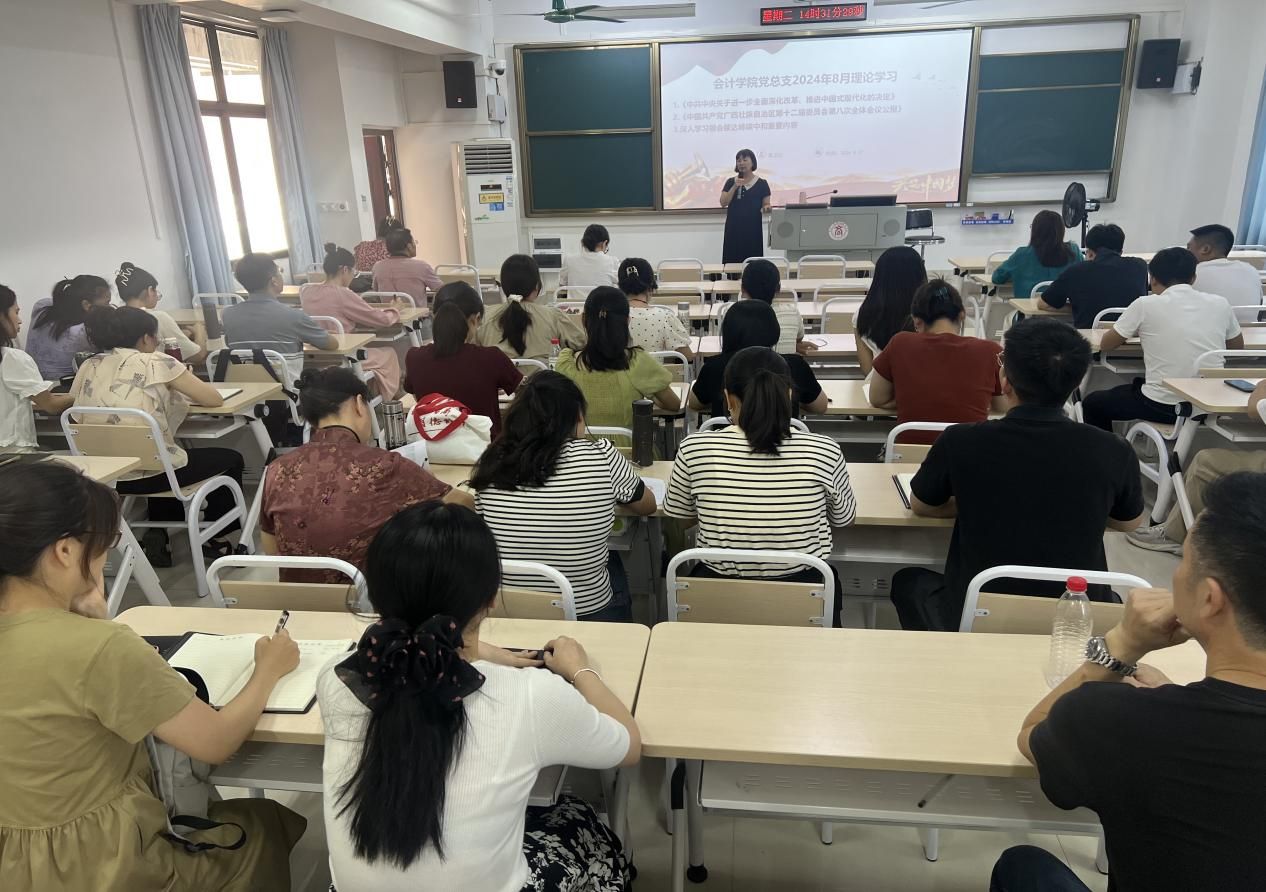 2024年8月27日,会计学院党总支于武鸣校区A2-301教室召开八月理论学习会。本次会议聚焦深入学习领会党的最新政策与理论以及碳达峰碳中和的重要内容,由会计学院党总支书记、院长粟卫红同志主持,全体教职工积极参与。