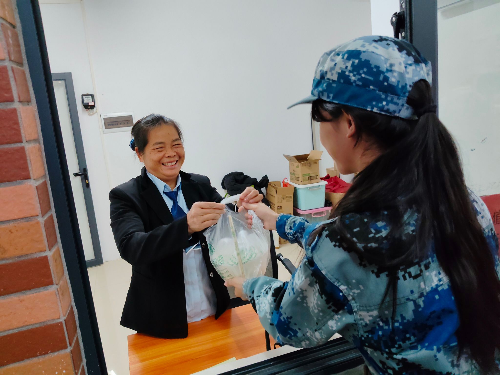 当饺子的香气弥漫整个食堂,活动的意义在分享中得到了升华。同学们没有急于品尝自己的成果,而是首先想到了一线一直默默守护校园安全的保安、宿管员们,院团委、学生会的同学们化身“温暖派送员”,将刚出锅、饱含温情的饺子,送到了宿管阿姨和学校保安的手中。这份突如其来的关怀,让坚守岗位的他们脸上绽放出惊喜又感动的笑容。这一刻,饺子的温度,从手心传到了心里。