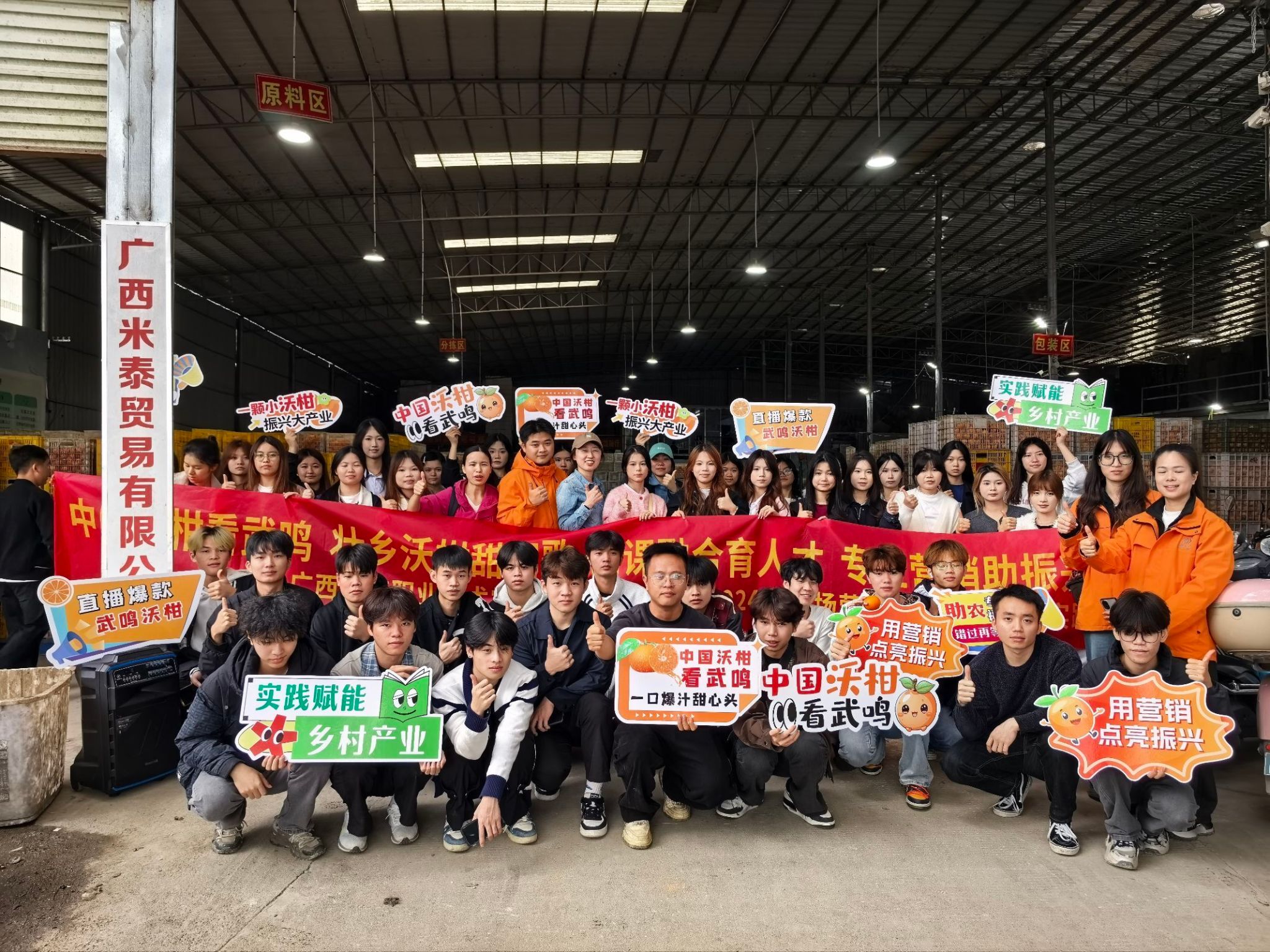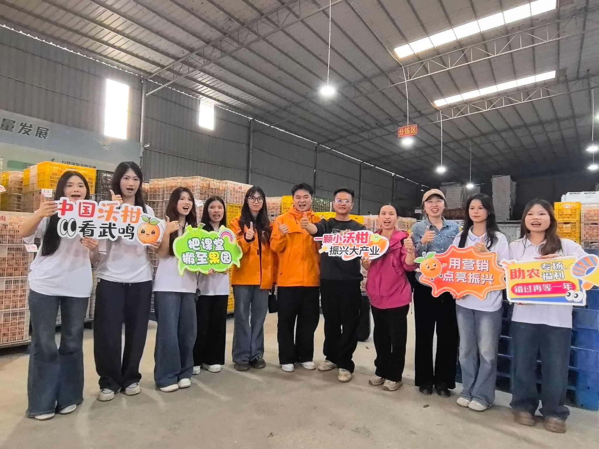 师生一行先后走访了鑫天兰农业有限公司果园基地与广西鸣鸣果业有限公司果园基地,实地考察沃柑种植环境、采摘流程与品控体系。企业负责人详细介绍了沃柑的品种特点、种植技术与品牌发展历程,并带领师生深入果园和供应链工厂,讲解果品分级、包装与供应链运作模式。学生们结合专业学习需求,重点围绕目标客群、产品卖点、品牌打造、市场推广等内容展开实地访谈与素材采集,为后续撰写市场调研报告、创作推广内容积累了一手资料。