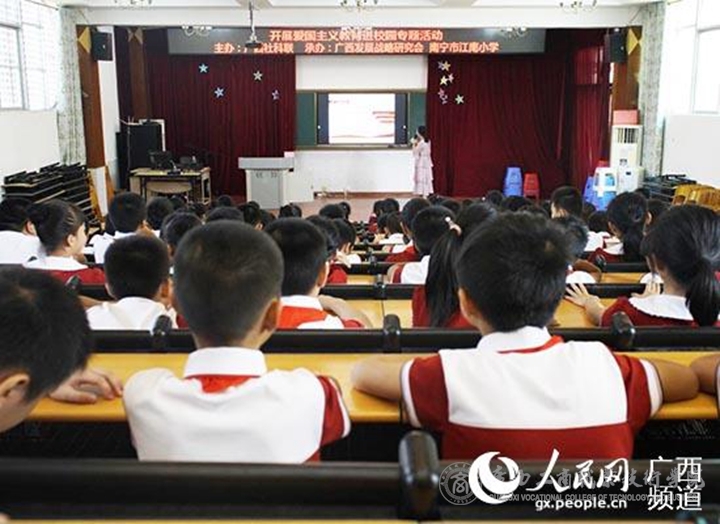 人民网南宁10月12日电 开展爱国主义教育进校园实践活动,让学生处处受到爱国主义精神的感染,激励着一代又一代中华儿女为祖国繁荣发展不懈奋斗。2019年6月至9月,广西壮族自治区社会科学界联合会积极推动社会科学普及工作,深入基层开展爱国主义教育进校园系列专题活动,受到了广大师生的欢迎。