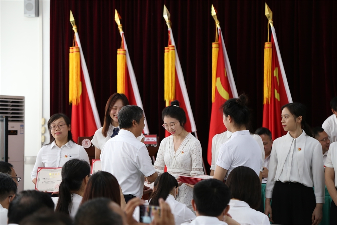 在庄严的国歌奏唱结束后,首先由2022年第一批新发展党员代表进行入党宣誓。随后覃武云书记为黄伟学同志颁发“光荣在党50年”纪念章。