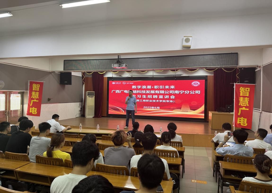 为推动2023级学生岗位实习工作,2025年6月6日下午,人工智能学院邀请广西广电网络科技发展有限公司南宁分公司到校开展实习生招聘宣讲会。本次宣讲会受到双方高度重视。人工智能学院副院长张锋雄、信息技术教研室主任赵明艳等教师出席,广西广电网络科技发展有限公司南宁分公司副总经理李哲携市场部、校园事业部等部门负责人参会。
