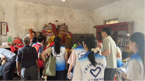 倾听历史,传承红色基因。 下午,团队怀着敬意走访慰问村中三位老党员。成员们悉心聆听老支书苏显同结合自身经历,剖析当前村庄发展面临的现实挑战,特别是农产品销路不畅与村民就医不便等痛点;党龄52年的青文保老人深情讲述“那床村”村名历史渊源,让队员们深刻感知乡土发展的厚重脉络;老党员黄日葵则自豪介绍村里濒临失传的特色传统技艺——纯手工制作表演狮子头,其精美造型与鲜艳色彩承载着独特的村落文化记忆。这场面对面的历史访谈,不仅传递了关怀,更是一次生动的红色精神洗礼与乡土文化教育。