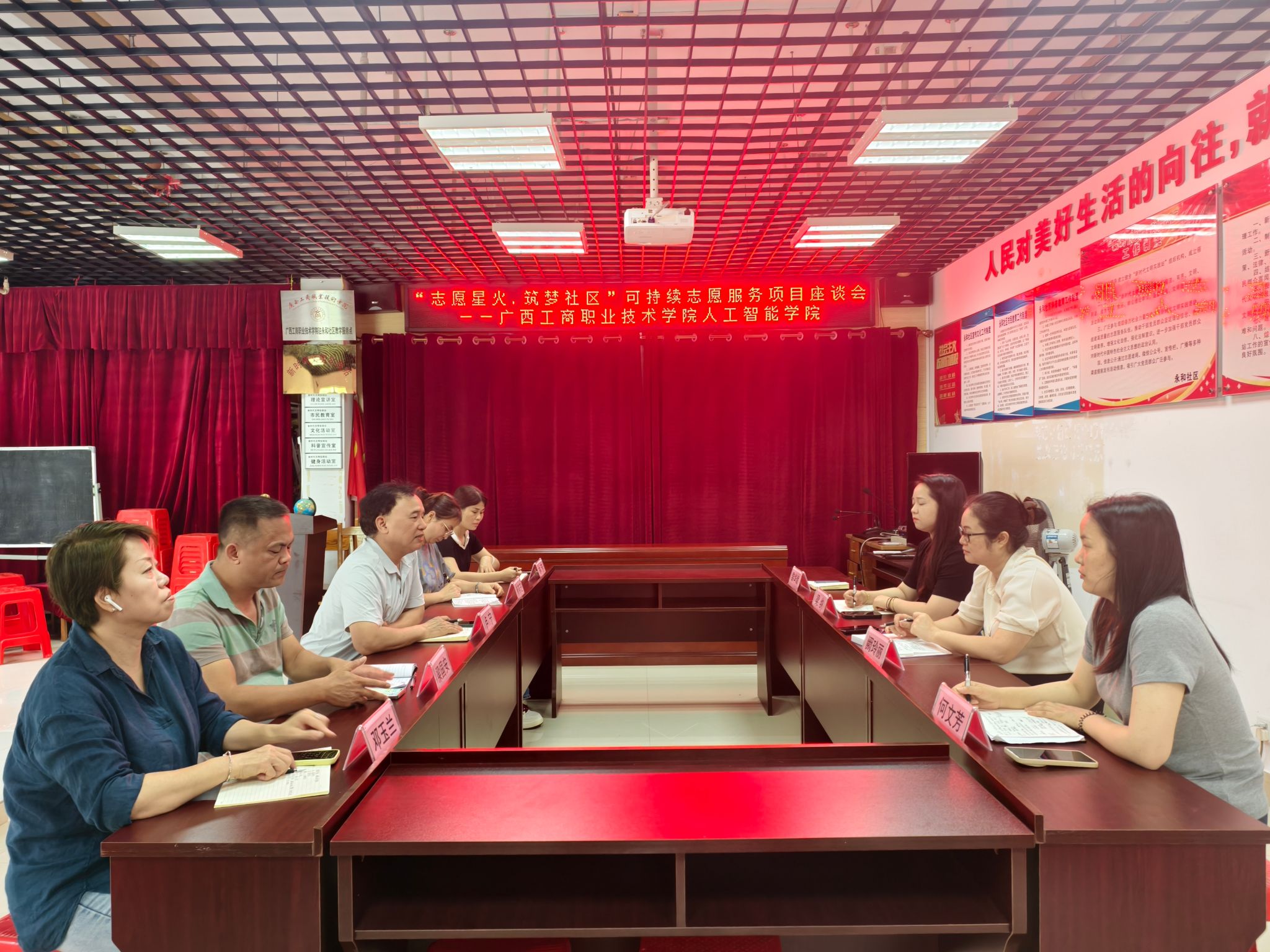 为搭建校社合作桥梁,探索“志愿服务 + 社区治理”新模式,实现校社资源与需求精准对接,2025年6月13日,人工智能学院阙玲丽副院长、专职辅导员梁纳及何文芳等一行前往永和社区,与社区党委领导班子成员开展“志愿星火,筑梦社区”可持续志愿服务项目座谈会。双方围绕党建共建、志愿服务等议题展开深度交流。