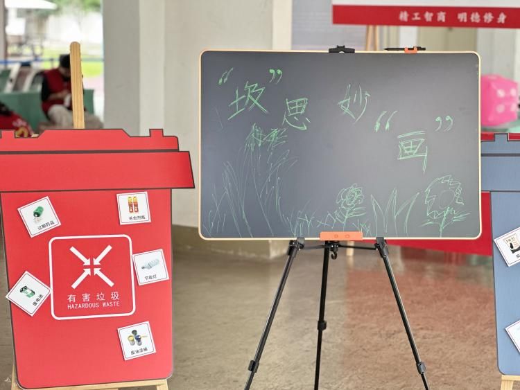 活动现场布置充满创意,主题展板分别用“厨余垃圾、有害垃圾、其他垃圾、可回收垃圾“四个垃圾桶造型摆放,中间画板写着“圾”思妙“画”四字,更加凸显活动主题。