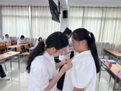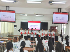 梁纳老师宣读雷丽莹、伍文丽等39名新团员名单。优秀团员为新团员佩戴象征光荣与责任的团徽。全体新团员在梁纳老师带领下庄严宣誓,许下坚定承诺。