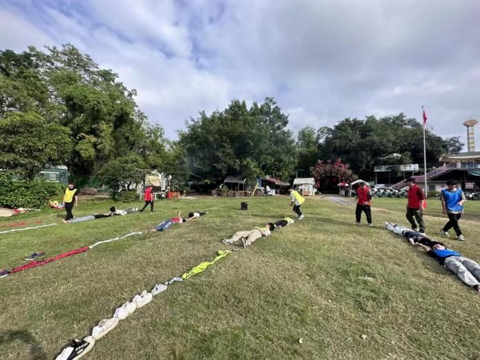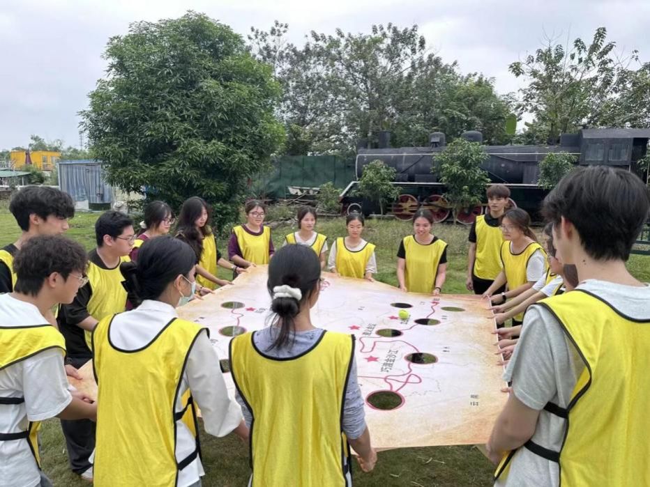 随后的素质拓展环节内容丰富、节奏紧凑。“重走长征路”项目中,各小组依托长征地图,模拟“血战湘江”“巧渡金沙江”等关键节点,在协作中感悟信念与智慧的力量;“击鼓颠球”环节,队员们凝神聚力、默契配合,用一次次击球诠释团结的意义;“支援前线”任务中,“前方”与“后方”高效联动,迅速传递物资,展现出强烈的集体荣誉感。