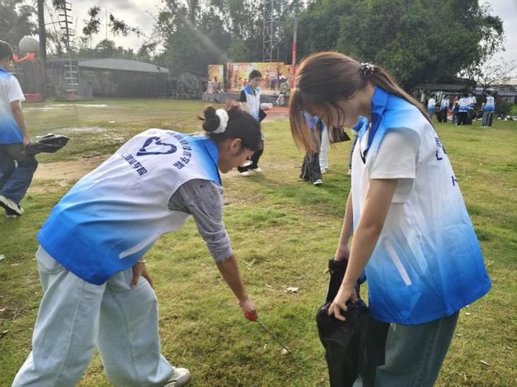 拓展结束后,活动转向环保实践。同学们手持清洁工具,细致捡拾园区垃圾,并对可回收物进行分类处理,以实际行动守护绿水青山,也将红色精神中蕴含的担当意识落到了实处。