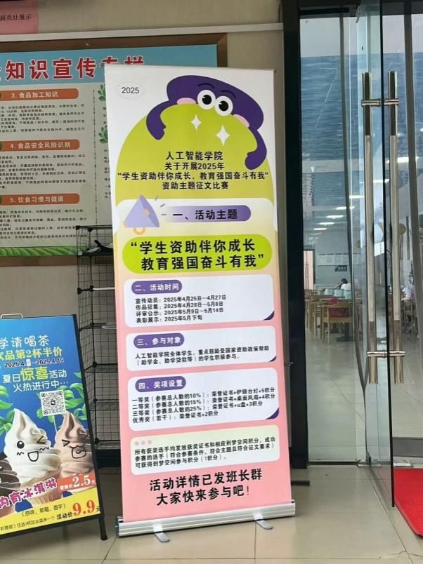 宣传动员阶段,学院充分利用多种渠道营造活动氛围。通过在食堂一楼人流密集区域摆放涵盖比赛主题、参赛要求、奖项设置等关键信息的易拉宝,吸引同学们驻足了解;同时,动员辅导员通过班级群、线下班会等形式,向同学们详细解读活动意义,鼓励大家回顾受助经历,书写成长故事。