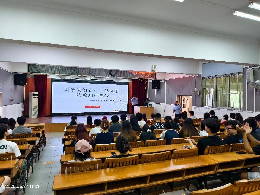27日上午,学院分别在中尧校区和鹏飞校区开展安全教育主题讲座。此次讲座邀请新阳派出所反诈专员欧警官为同学们讲解如何防范电信网络新型违法犯罪。 欧警官围绕当前电信诈骗案件的模式和种类,向同学们展示了电信诈骗作案手段多、花样新、涉案资金转移快以及地域性特征突出等特点,并详细说明了诈骗分子的作案流程和防范要点,从多方位提醒同学们警惕校园电信诈骗。