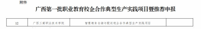 11月7日,自治区教育厅公布了广西第一批职业教育校企合作典型生产实践项目名单,高职组共有12个项目获评广西职业教育校企合作典型生产实践项目,其中我院申报的智慧粮食仓储与配送校企合作典型生产实践项目成功入选。