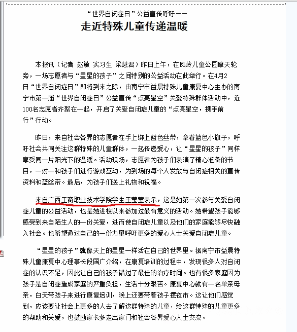 2015年3月29日,由南宁市益晨特殊儿童康复中心主办南宁市民政局与南宁市残疾人联合会承办的“点亮星空,携手前行!”公益计划——南宁市第一届“世界自闭症日”公益活动在南宁市凤岭儿童乐园举行,我院红十字会服...