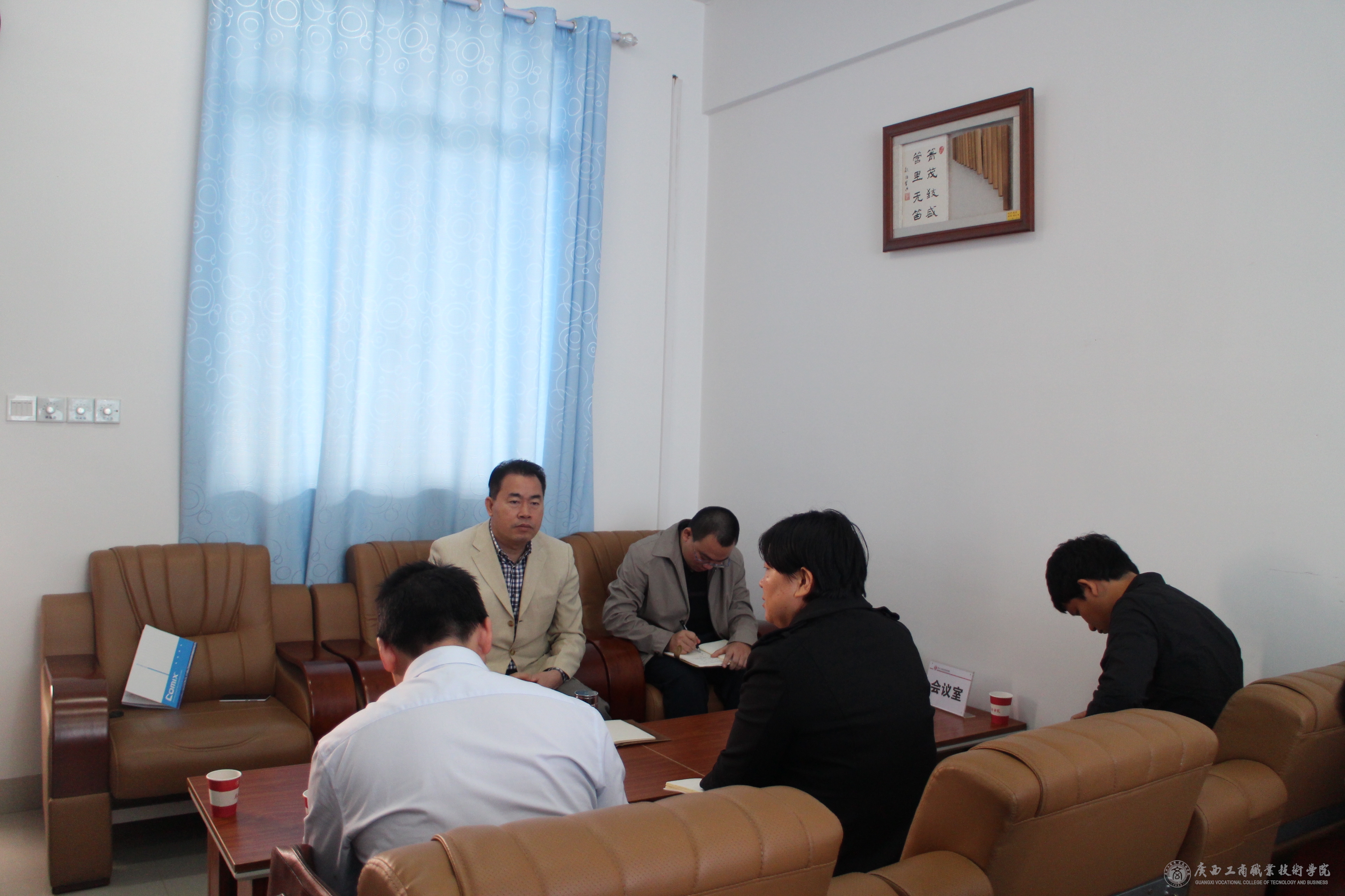2015年10月26日上午9时,梧州职业学院聂振传院长一行3人到我院考察交流。我院党委书记覃武云、院长陈杰热情接待了聂振传院长一行。 随后我院院长陈杰、副院长李维和党委办公室(学院办公室)负责人与聂振传院长一...