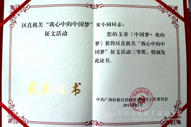 近日,从自治区区直机关工委传来喜讯,我院12级会计系宋小园同学的文章《中国梦.我的梦》在区直机关“我心中的中国梦"征文活动中荣获得三等奖,该文已被录入《2014年区直机关我心中的中国梦征文集锦》当中。由于...