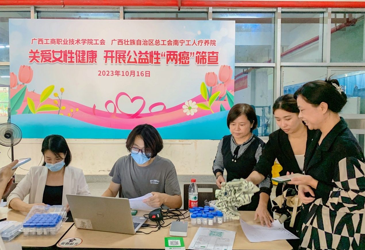10月16日下午,学院与广西壮族自治区总工会南宁工人疗养院在鹏飞校区开展“关爱女性健康 开展公益性‘两癌’ 筛查”体检服务,为学院一线女教职工体检。(活动现场)开展公益性“两癌 ”筛查服务活动是自治区总工...