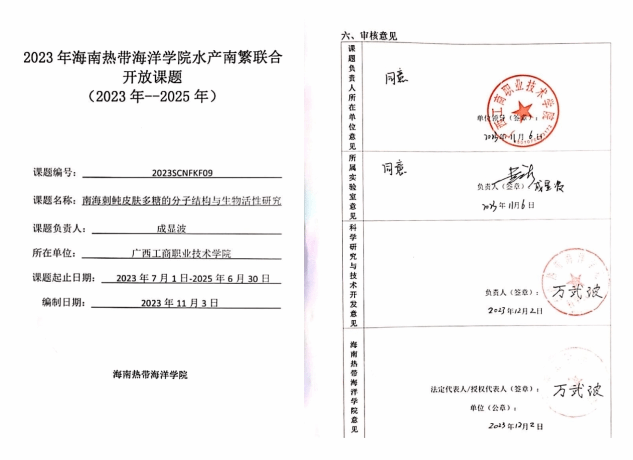 近日,我院成显波博士主持的研究课题《南海刺鲀皮肤多糖的分子结构与生物活性研究》成功获得水产南繁联合科研平台立项。该课题将围绕食品科学与生命科学及人体健康展开深入研究,特别是从分子层面对多糖进行功能...