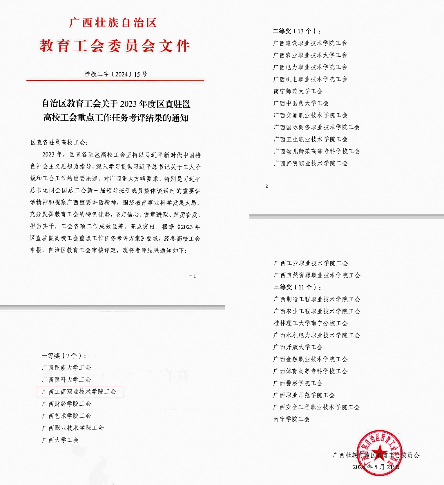 学校荣获2023年度区直驻邕高校工会重点工作任务考评一等奖