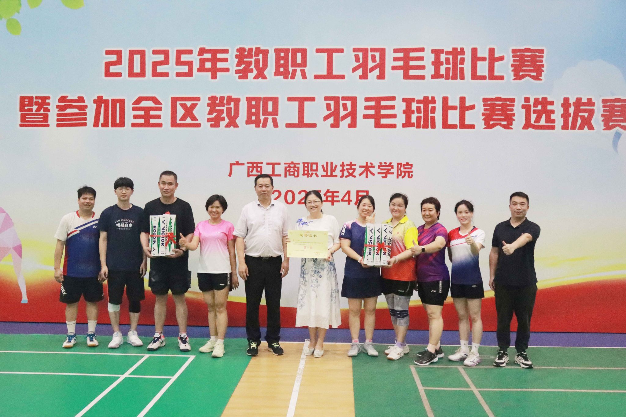 4月18日,学校在鹏飞校区举行2025年教职工羽毛球比赛暨参加全区教职工羽毛球比赛选拔赛开赛式。学校领导李维、刘进、安仲文、韦云凤、陈宁春、阙勇平出席开赛式。各代表队全体人员,各部门、各单位代表队领队、教...