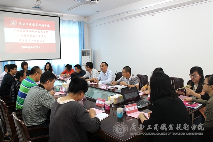 2016年4月21日下午,广西国际商务职业技术学院学工处罗兰芬处长一行,广西经贸职业技术学院学工处潘文生处长一行到我院就学生公寓管理、学生日常事务管理等方面的内容与我院学工处进行了工作交流。学院党委蒙启成...