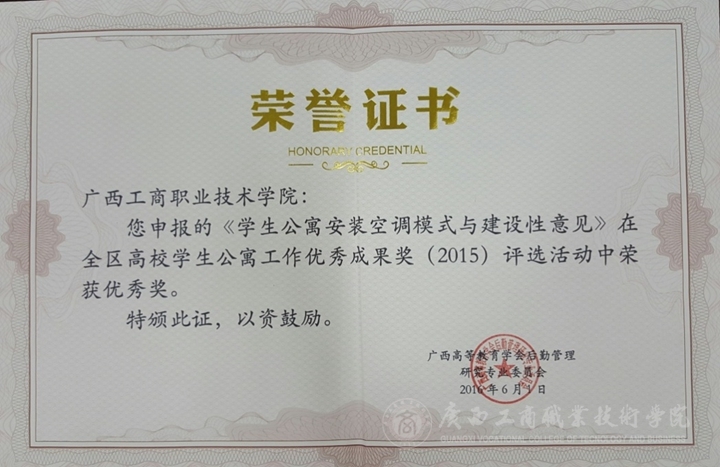 近日,在广西高等教育学会后勤管理研究专业委员会组织举办的全区高校学生公寓工作优秀成果奖(2015)评选活动中,我院党委学生工作部(学工处)申报的《学生公寓安装空调模式与建设性意见》荣获优秀奖。 ...