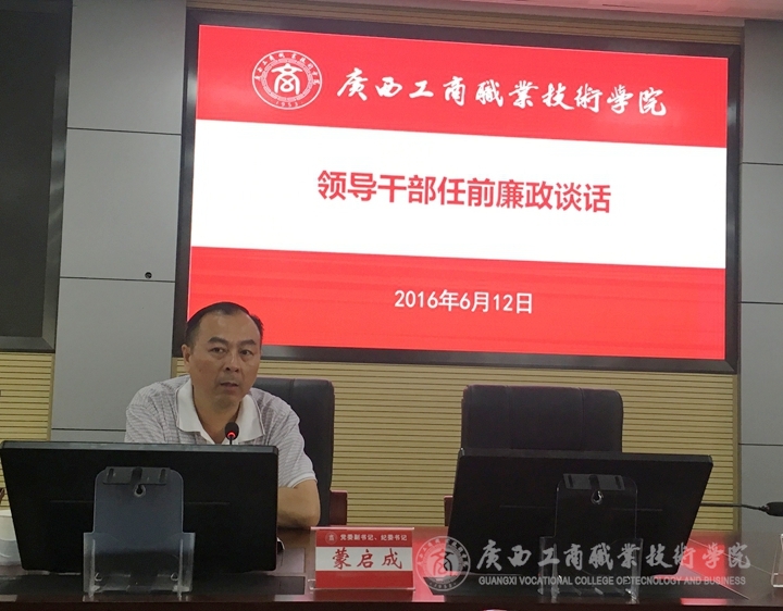2016年6月12日下午,学院党委副书记、纪委书记蒙启成同志对6位新调整工作岗位的处级干部做任前廉政谈话。会上,蒙启成对6位处级领导干部提出了四点要求:一是认真履行党风廉政建设“一岗双责”责任,管好自己部门...