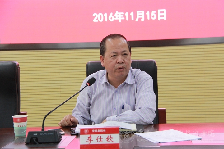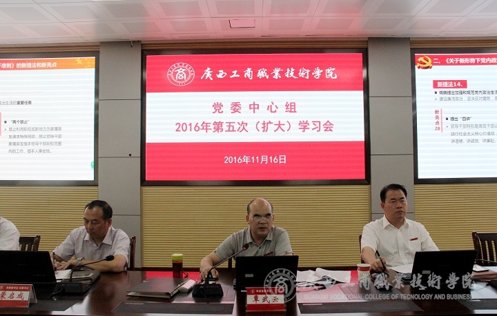 2016年11月16日下午,我院在校本部召开2016年第五次(扩大)学习会。学院党委书记覃武云、党委副书记、院长陈杰、党委副书记、纪委书记蒙启成、副院长李仕钦、副院长李维、学院副厅级调研员黄永蓬、副院...