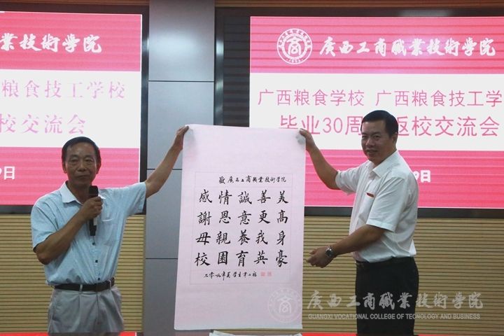 在交流会现场,经济871班班主任韦小福老师书法写作留赠学院,品味书法意境:“感情诚善美、谢恩意更高,母亲养我身,校园育英豪。”竖着读下来就是“感恩母校”。韦小福老师退休前多年在学校教授书法课,传承商院文化,体现了“精工智商 明德修身”的校训精神,留给学院一份珍贵的纪念。