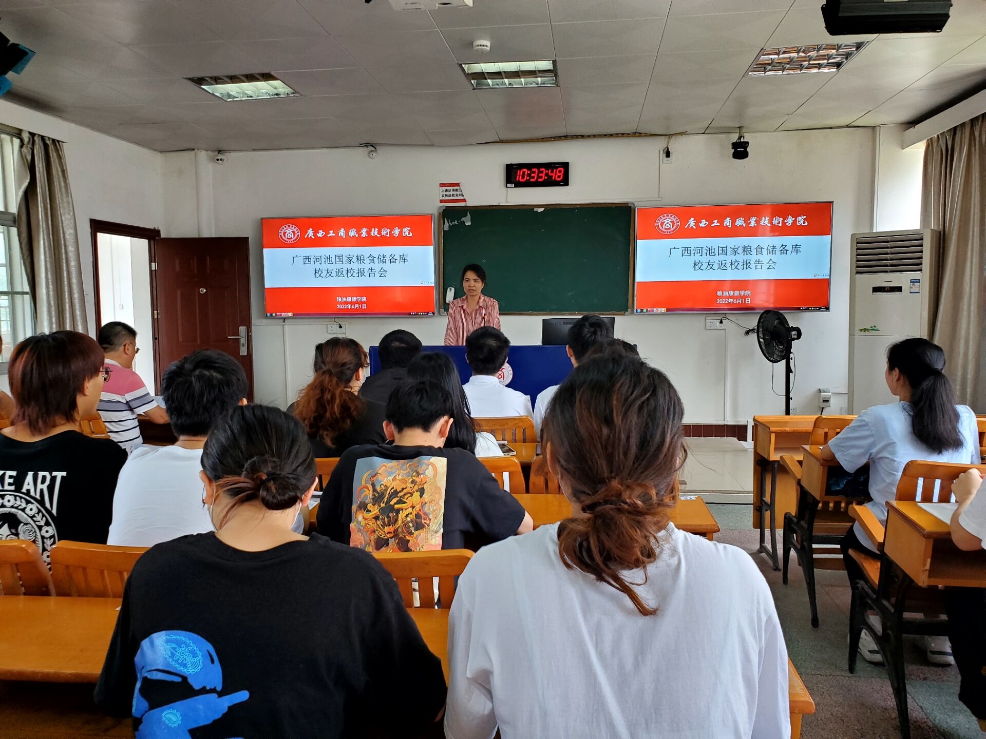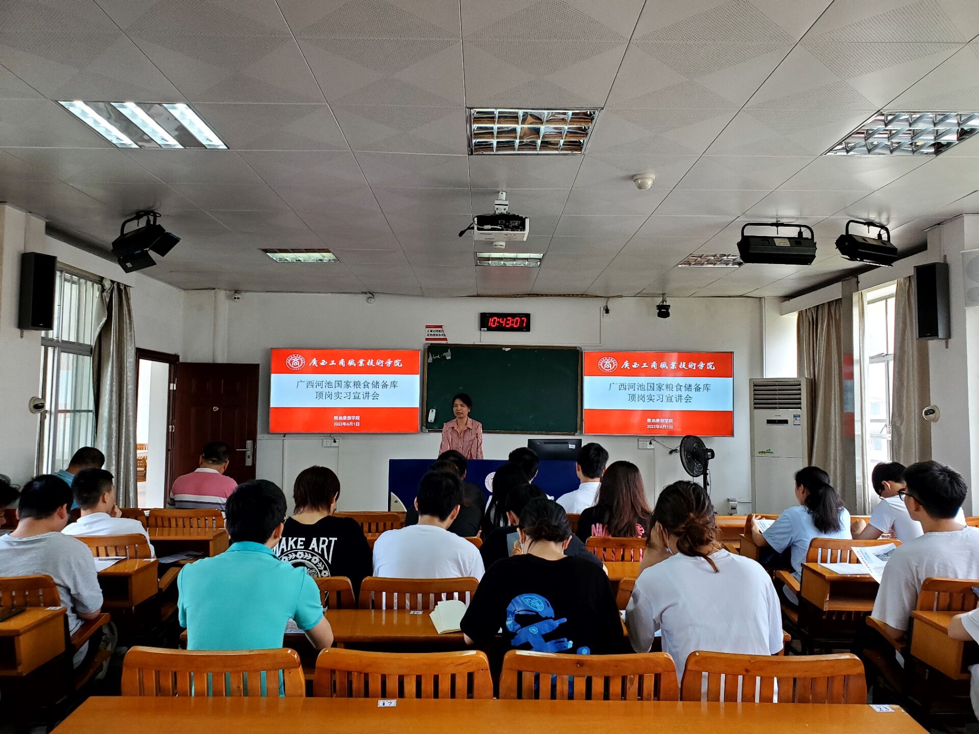 上午10时30分,广西河池国家粮食储备库的校友来到中尧校区,毕业于我院(原广西粮食学校)的83级校友覃霞及88级校友卢涛,本次以广西工商校友的身份,来给20级粮储班的学弟学妹们做一些答疑和职业经验分享。在宣讲过程中,广西河池国家粮食储备库书记覃霞首先向同学们详细介绍储备库的坏境、发展和工作内容等情况;此外,还讲解招聘岗位需求、晋升、福利待遇等与同学们求职密切相关的各项事宜。同学们积极提问,学长学姐为学弟学妹们真诚解惑,知无不言,言必切中要点,对同学们即将到来的实习工作给了很多切实可行的建议,也从粮食工作者的角度出发,给了学弟学妹们值得借鉴的发展规划。
