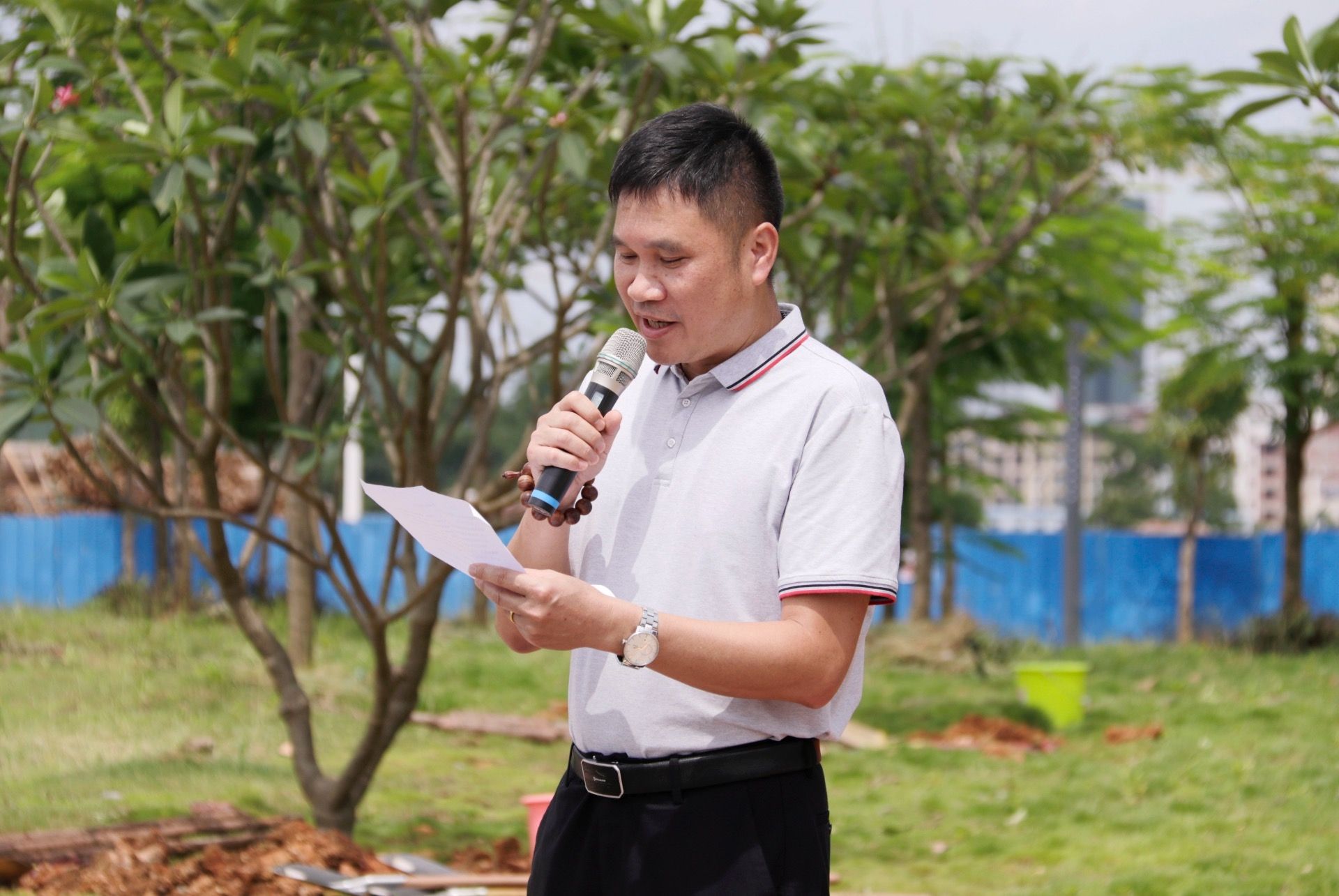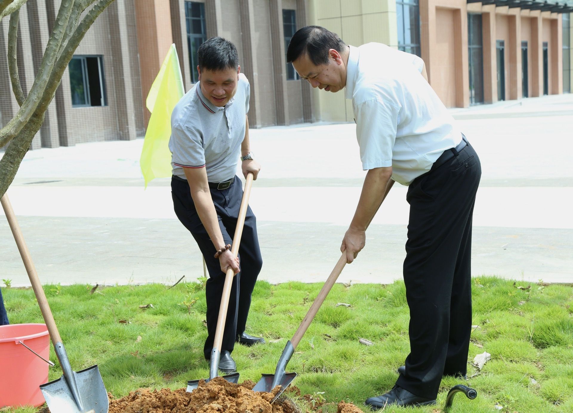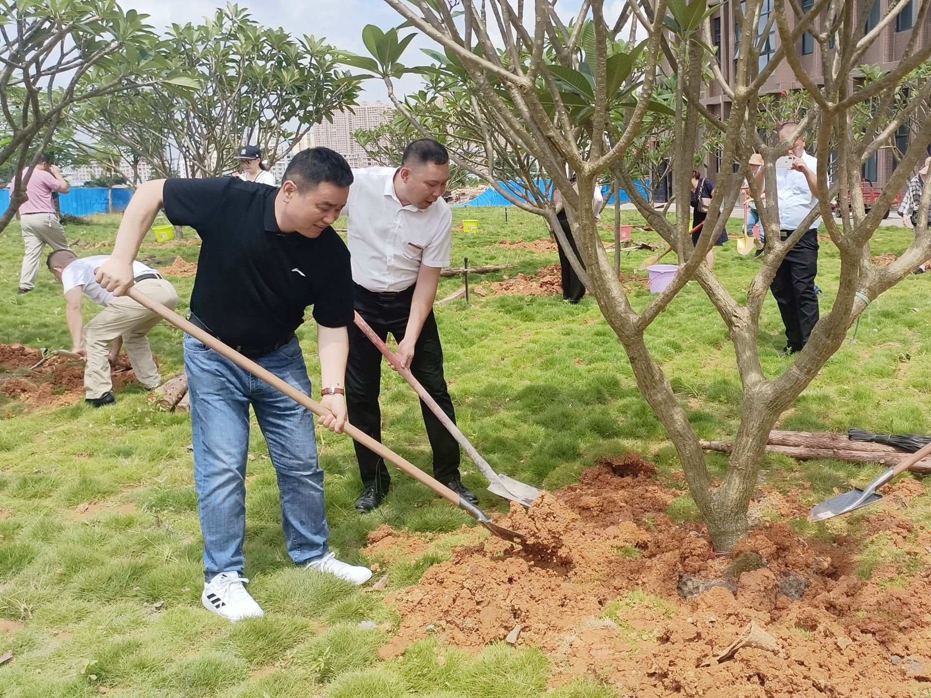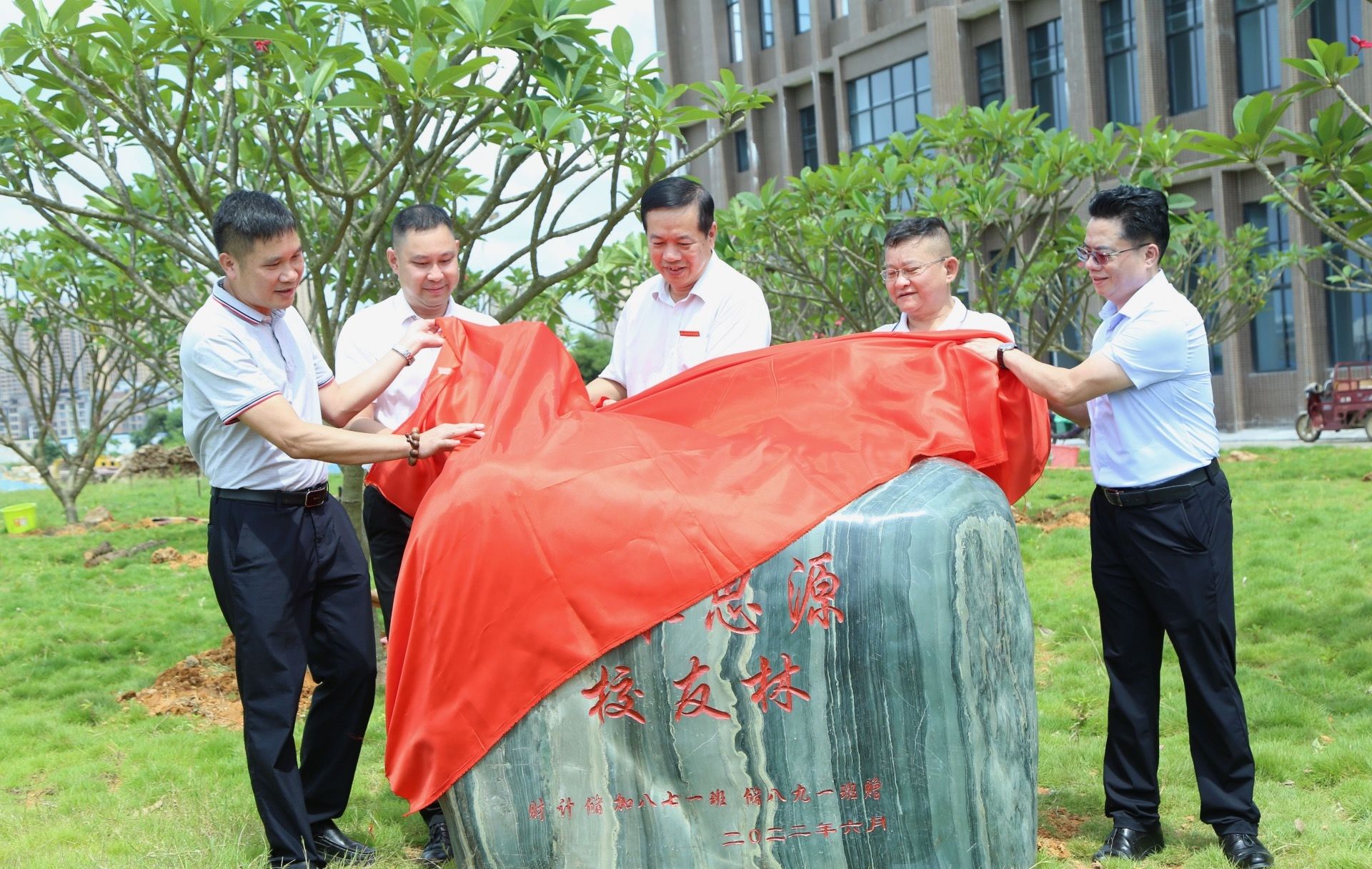在欢快的气氛中,学院领导和校友代表共同为校友林举行了揭幕仪式,并一同为校友们捐赠的孕育希望的缅栀子树苗培土浇水。