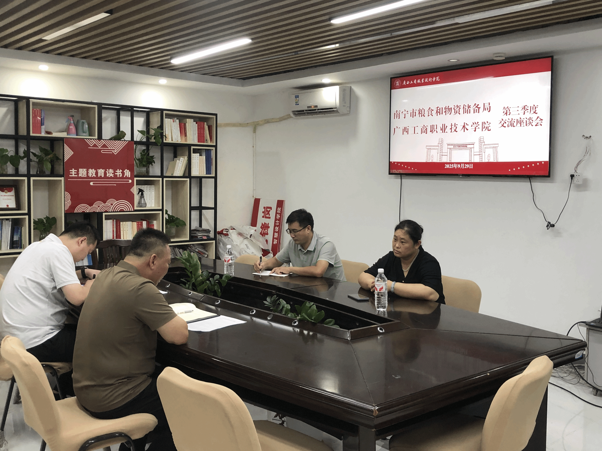 在沟通交流环节,闭鸿副书记对学校粮食专业人才培养成效给予肯定,结合南宁市粮食行业发展实际,分析了当前粮食系统对仓储管理、质量检测、智能化粮储等方向的人才需求趋势,并就专业课程与行业标准衔接、实践教学基地建设提出建议,针对毕业生进入粮食系统就业的政策支持、岗位信息对接流程等内容进行详细说明,为学校就业服务提供参考。莫春华处长进一步围绕粮食行业政策动态、校企合作岗位开发展开探讨,同时提及学校粮食专业校友在南宁市粮食系统的就业分布与发展情况,提出希望联合市粮食局挖掘优秀校友资源,通过组织校友分享会、建立校友信息库等方式,为在校生提供职业规划参考,也为行业输送更符合岗位需求的人才。闭鸿副书记对此表示认可,认为校友是政校合作的重要纽带,可共同推动校友资源与人才培养、行业发展的深度融合。